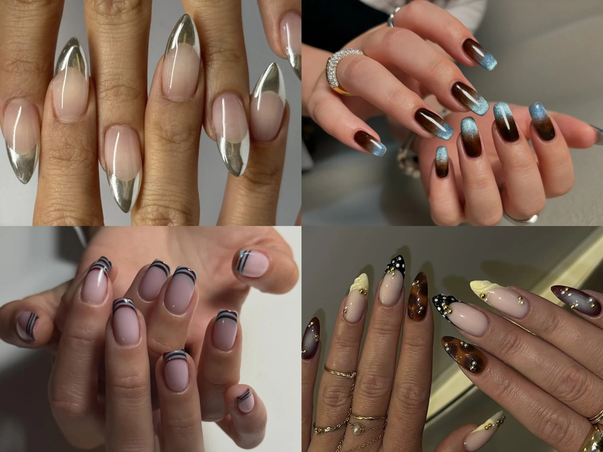 Забудьте о стандартных белых полосках. Используйте эффект «кошачий глаз», добавляйте стразы, бусины, анималистичные узоры, горошек и золото. Френч становится холстом для самых смелых идей.