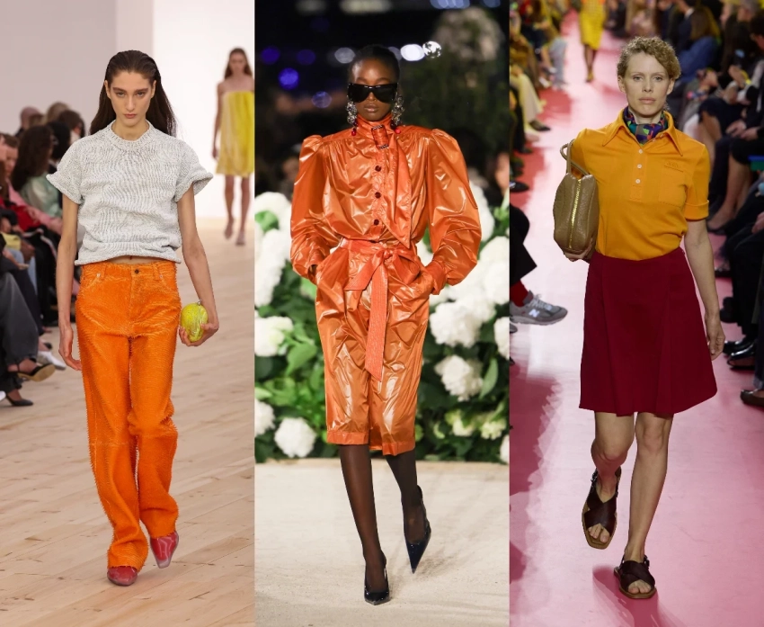 Дизайнеры используют его особенно тонко: Saint Laurent вводит оранжевый в кожу и замшу, Ferragamo — в шелковые платья с мягкими градиентами. Такой цвет не давит, а мягко подсвечивает образ.