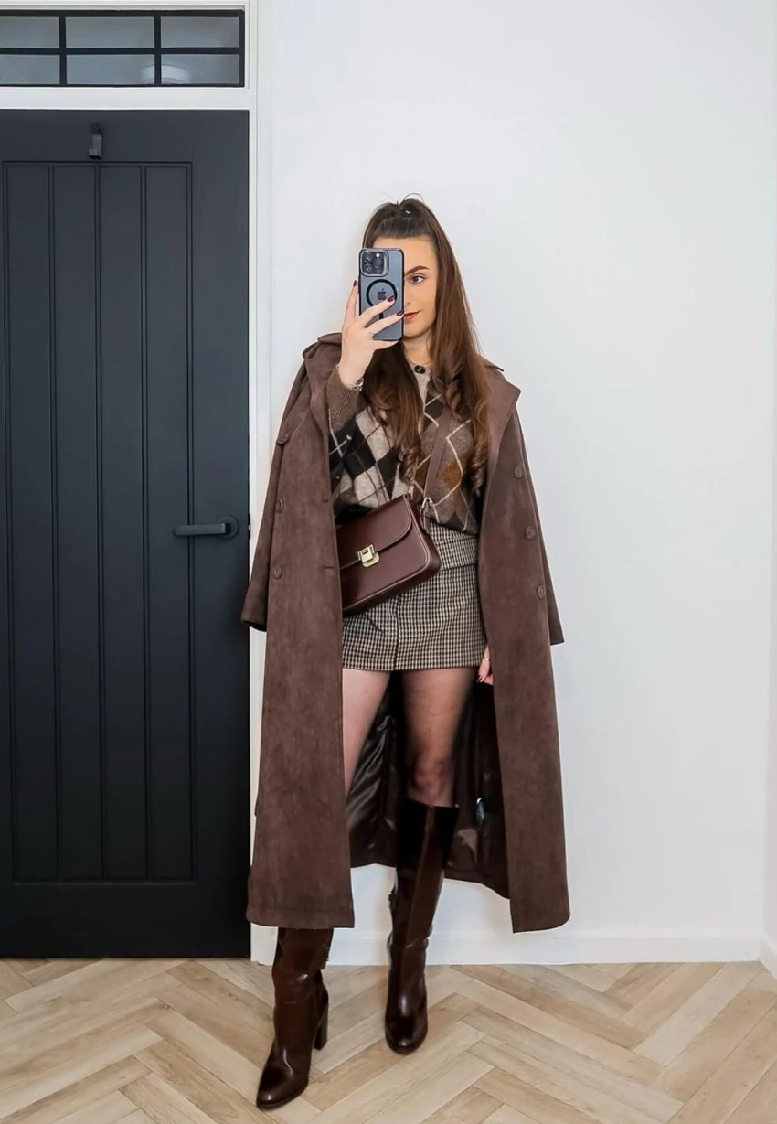Сочетание ботфортов с мини-юбками — проверенная формула, которая не теряет актуальности годами. Лучший выбор — мини из плотной шерсти, твида или экокожи. Для идеальных пропорций стилисты советуют оставить расстояние между краем юбки и верхом сапога, равное длине ладони.