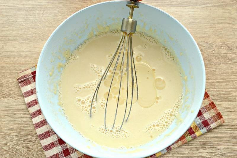 Нагретое до 50 градусов молоко (половину объема) вливаем и перемешиваем венчиком.