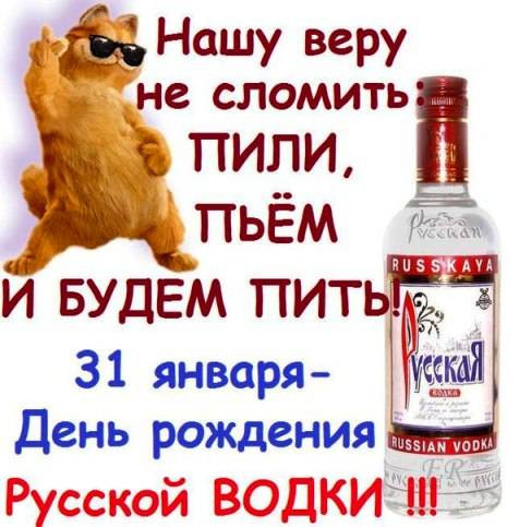 Сегодня у нас наливают не витаминный сок, не элегантное шампанское и не минеральную воду, а русскую водку, с которой праздник приобретает по-настоящему русский размах! С Днем русской водки! Употребляйте ее в хорошей компании, по доброму поводу и самого лучшего качества!
