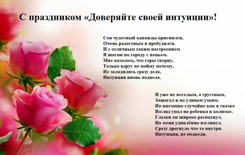 В день праздника «Доверь своей интуиции» можно поздравить близких, друзей, родственников и коллег. Это можно сделать не только лично или по телефону, но и через мессенджеры. В онлайне отправить поздравление еще проще, ведь доступны красивые открытки с поздравительными стихами и утонченными словами.