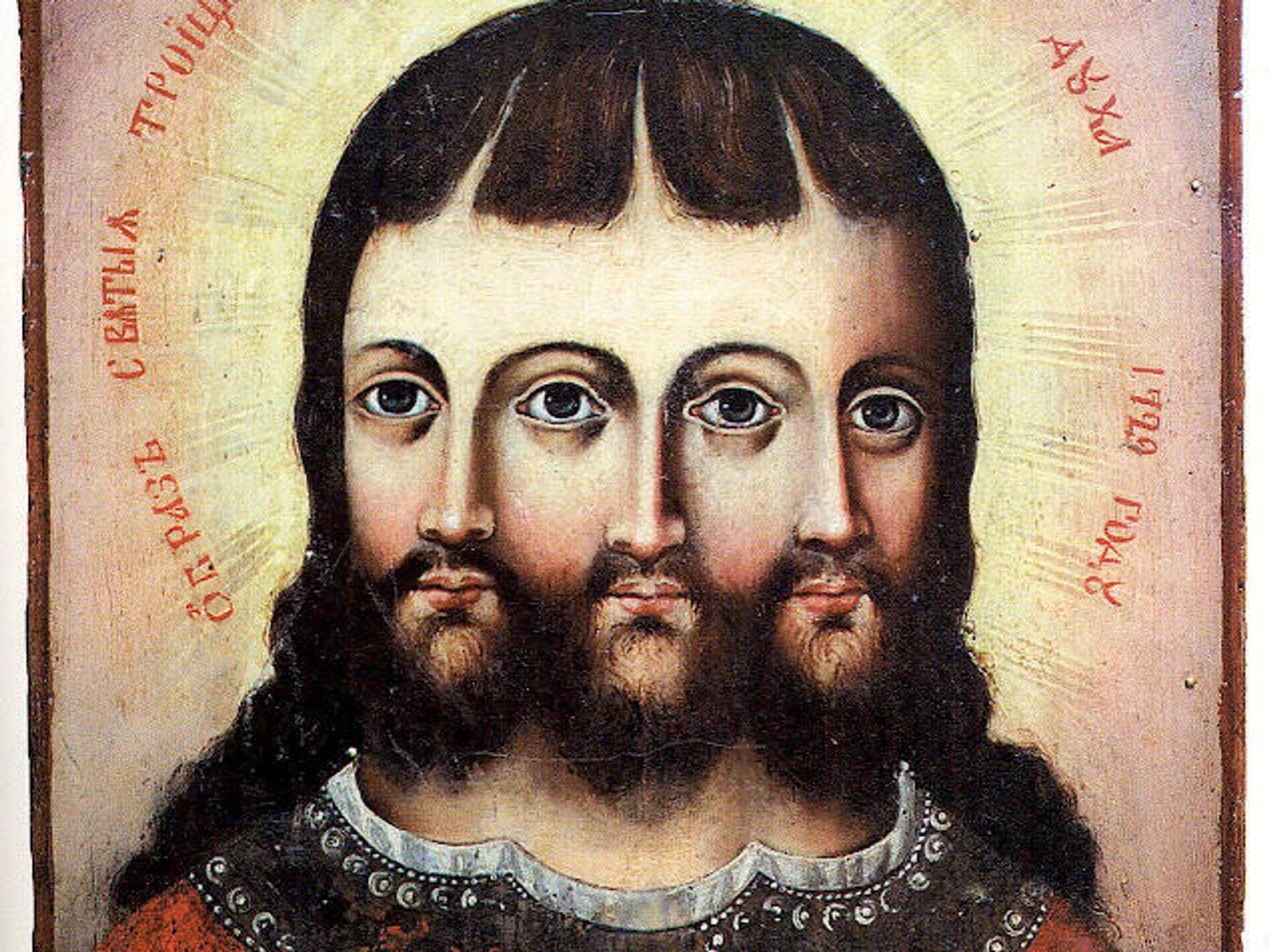 Идея изобразить Святую Троицу в буквальном виде пришла к иконописцам в X веке. В это время распространились иконы, на которых Отец, Сын и Святой Дух изображались в виде трёх одинаковых фигур. Однако некоторые иконописцы пошли дальше и изобразили Христа с тремя головами на одном теле, что отражало западное учение о Филиокве — доктрину, согласно которой Святой Дух исходит не только от Бога Отца, но и от Бога Сына.