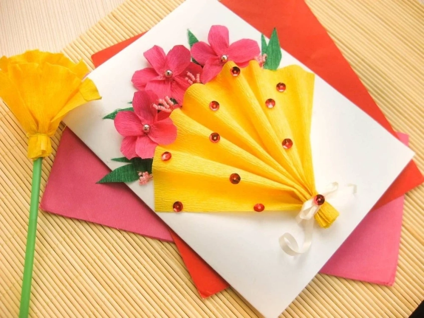Сложите каждый лист пополам, вырежьте заготовки цветов и соедините их в объемный букет. Прикрепите композицию к цветному картону и добавьте внутри теплое поздравление.